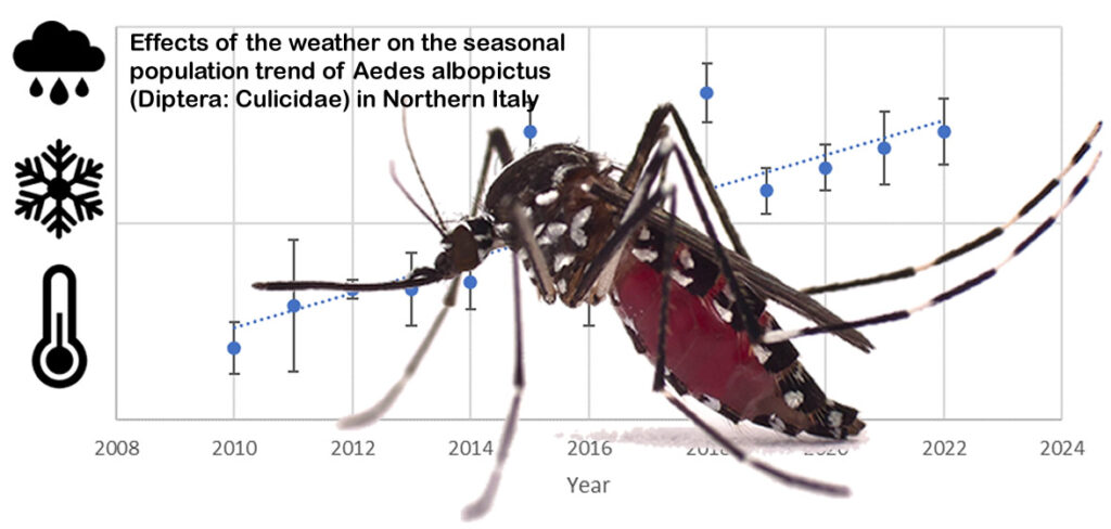Background: Aedes albopictus, the Asian tiger mosquito, has become a prevalent pest in Italy, causing severe nuisance and posing a threat of transmission of arboviruses introduced by infected travelers. In this study, we investigated the influence of weather parameters on the seasonal population density of Aedes albopictus.