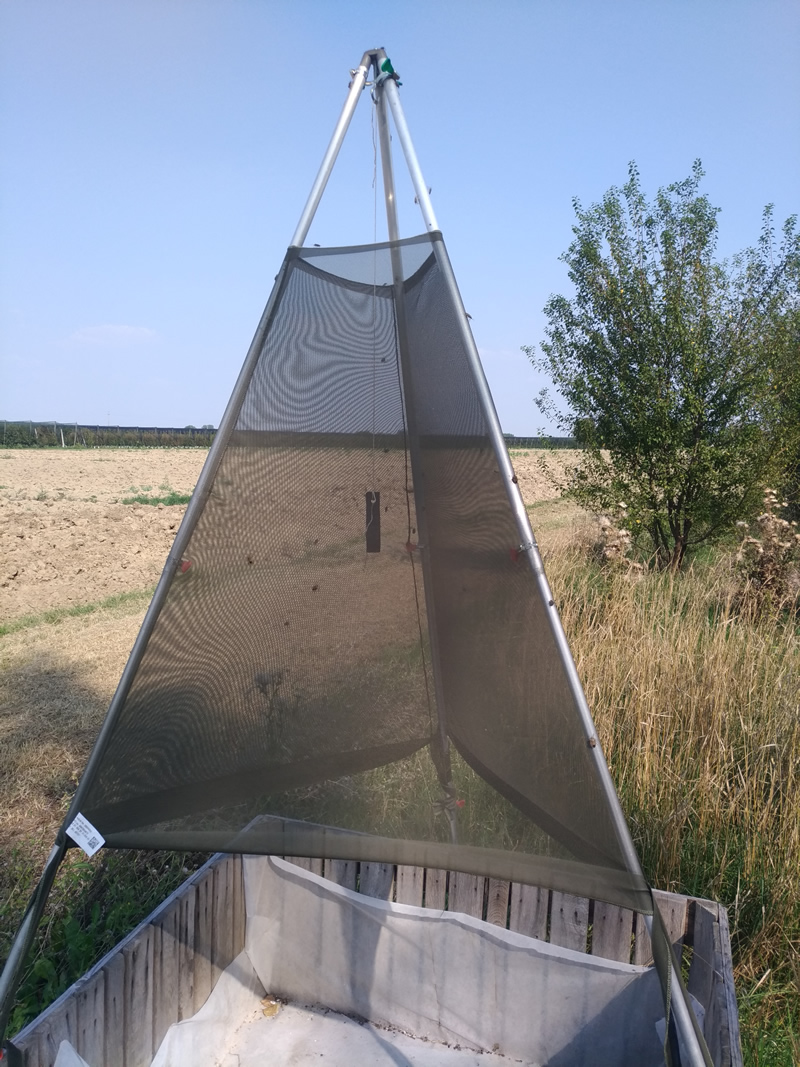 La trappola A&K testata è costituita da una rete impregnata di insetticida installata su un treppiede ed utilizza un superferomone di aggregazione che attira le cimici le quali, posandosi sulla rete, si intossicano per poi morire nelle vicinanze.