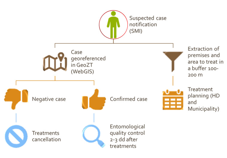 L’indagine viene condotta immediatamente a valle dei trattamenti intorno a casi sospetti o confermati (in un raggio di 100 metri se in zona con alta densità abitativa e 200 metri se in zona con densità abitativa più bassa) e consiste in: