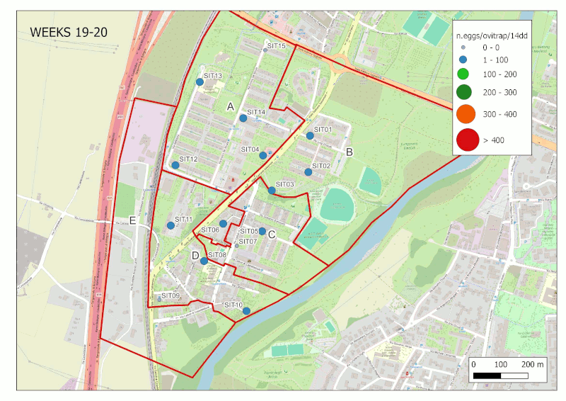 L’efficacia del trattamento porta-a-porta e dei rilasci di maschi sterili di Zanzara Tigre vengono valutati attraverso il monitoraggio ogni 14 giorni di 15 ovitrappole modello CAA14GG attivate da Maggio.