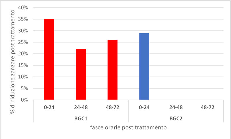 Nel grafico gli istogrammi mostrano la percentuale di riduzione, rispetto al pre-trattamento, per ciascuna trappola (BGC1 e BGC2) riferita alle diverse fasce orarie considerate (dove la riduzione era assente è stato indicato 0% negli istogrammi).